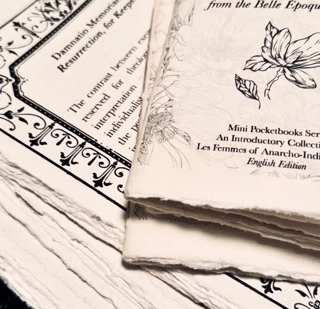 Also pictured here are new mini ‘pocketbook’ treasures. These little soft treats accompany an upcoming book by yours truly, titled Les Femmes Anarchistes Individualistes : De La Belle Époque À Nos Jours (The Individualist Anarchist Women, from the Belle Époque to Today). These luxe little saddle-stitched booklets contain micro-biographies of some of the women from the book. (Each woman has her own—like the one pictured here, for example, Jane Libertad.)